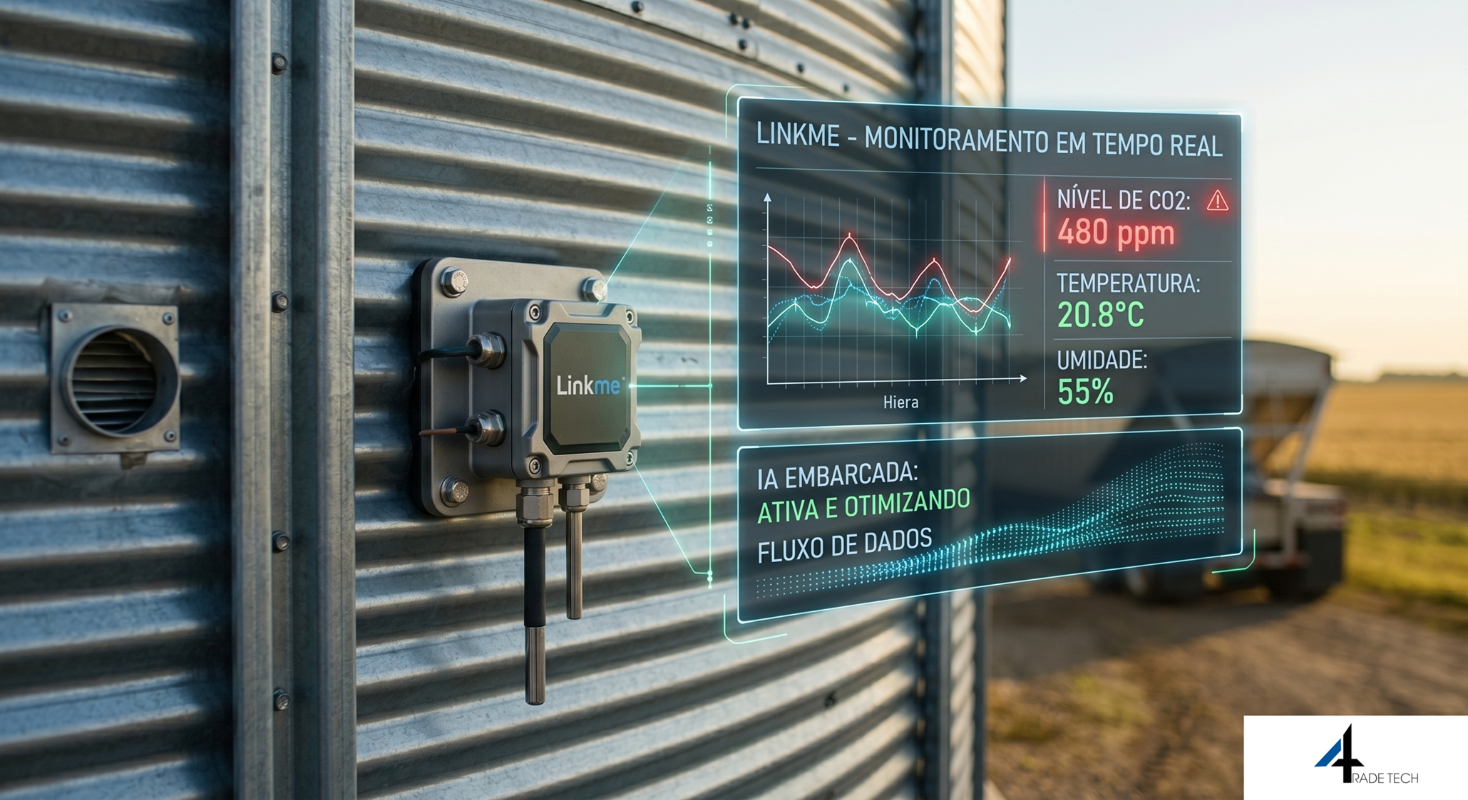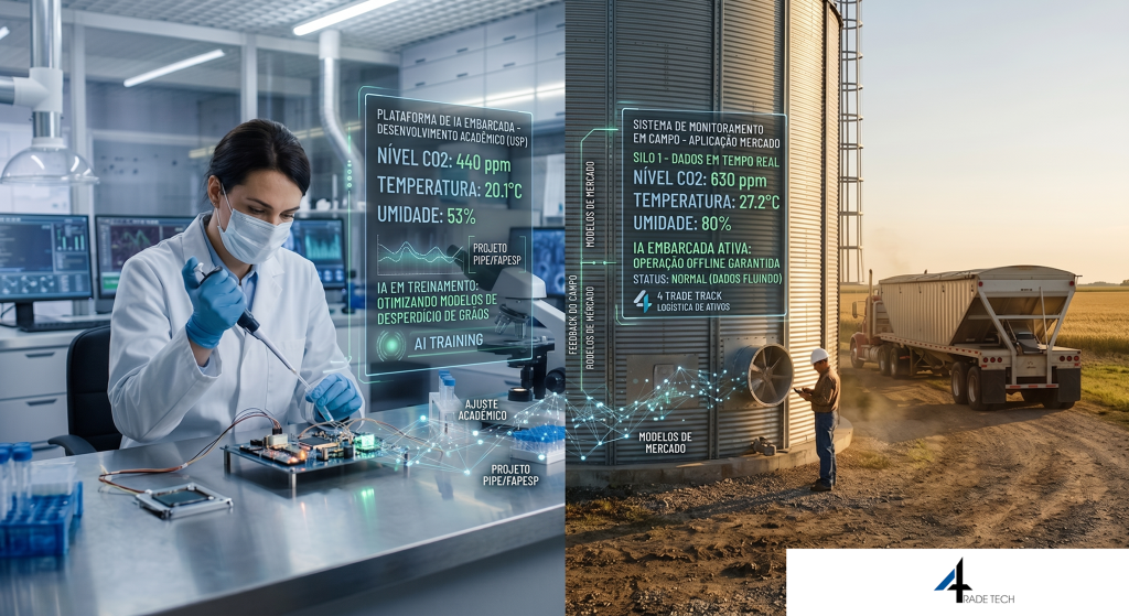 Startup com DNA USP focada em IA Embarcada para silos. A solução utiliza sensores de CO₂, umidade e temperatura para eliminar perdas significativas no armazenamento de grãos.